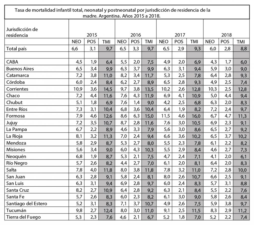 La media nacional, en tanto, fue de 8,8 muertes de niños cada 1000 nacimientos, en 2018.