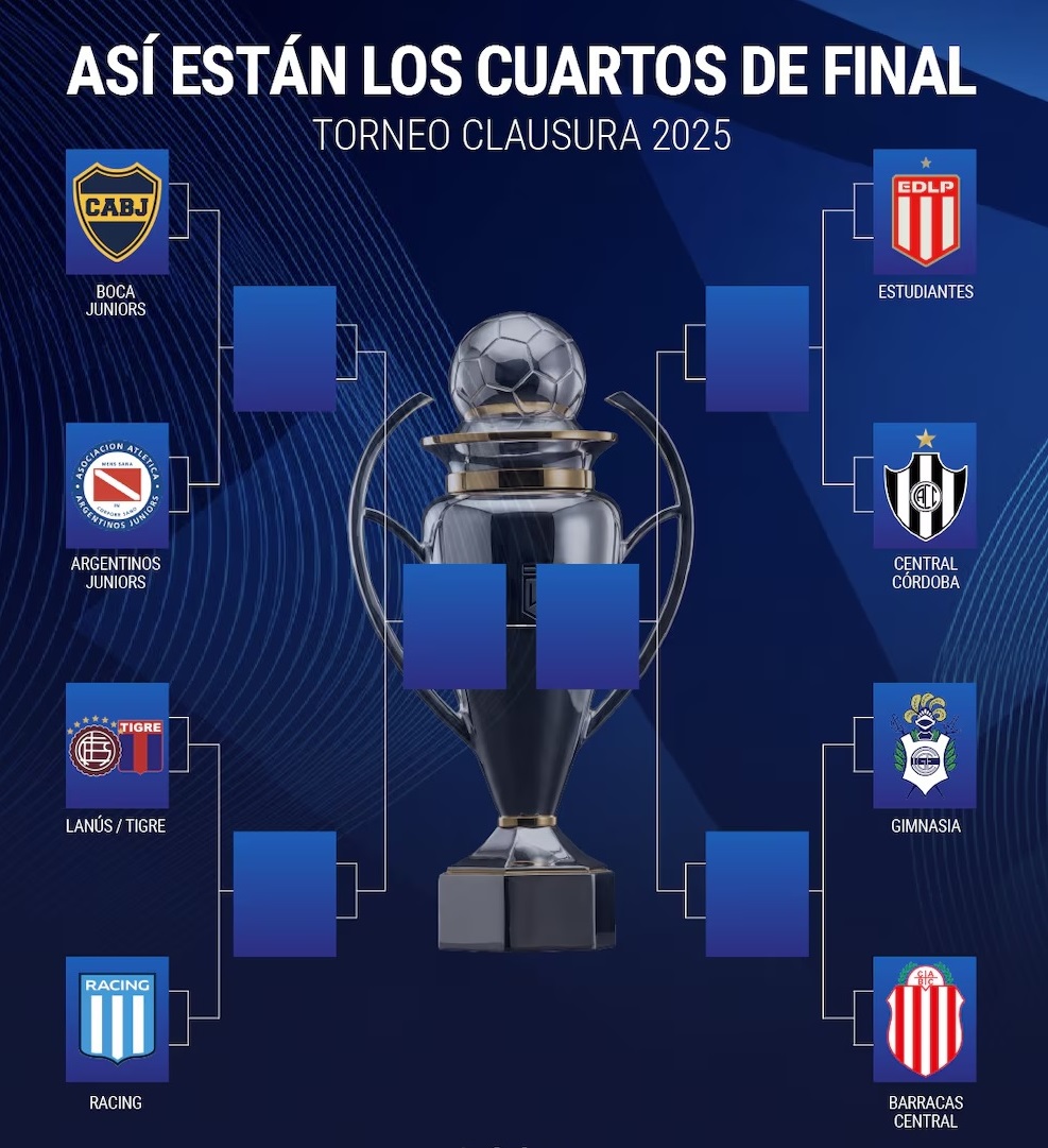 La serie de cuartos de final, al igual que las semifinales, se desarrollarán a partido único en el estadio del equipo que quedó mejor ubicado en la fase de grupos. En este contexto, Boca Juniors recibirá el domingo a Argentinos Juniors en la Bombonera, Central Córdoba será anfitrión el sábado en el Estadio Único Madre de Ciudades de Santiago del Estero de Estudiantes de La Plata y Barracas Central abrirá las puertas el lunes del Estadio Claudio Fabián Tapia para enfrentarse con Gimnasia La Plata.